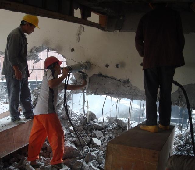 破坏性拆除:用空气镐锤,将混凝土一块一块地打碎,将其拆除?;蛘撸诨炷辽献昕撞⒂谜ㄒ┱?。